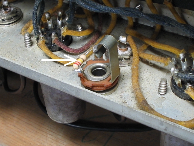 | Here's a minor "safety" mod that I learned from Gerald Weber's book: A Desktop Reference of Hip Vintage Guitar Amps. Just hang a 220k 1/4-watt resistor across the leads on the footswitch jack... |