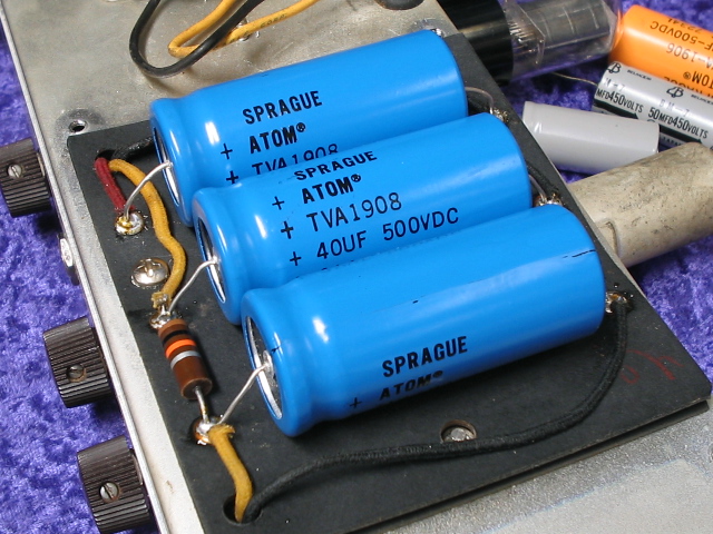| The next obvious step was replacing the filter caps: Even though the filter caps had been replaced before and weren't extremely old, they had been replaced at different times and were even mismatched values so it's a good practice to upgrade them and make sure that they are in good order. (inset shows new caps) |