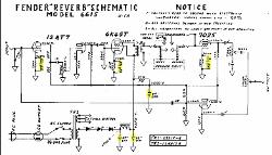 | Click on the images to download the schematic and layout diagram. (just right click on the image and select "save picture as") These are the original schematics for the 6G15 Reverb. I highlighted the caps that are most likely in need of attention and the photos above have arrows pointing to them for reference. |